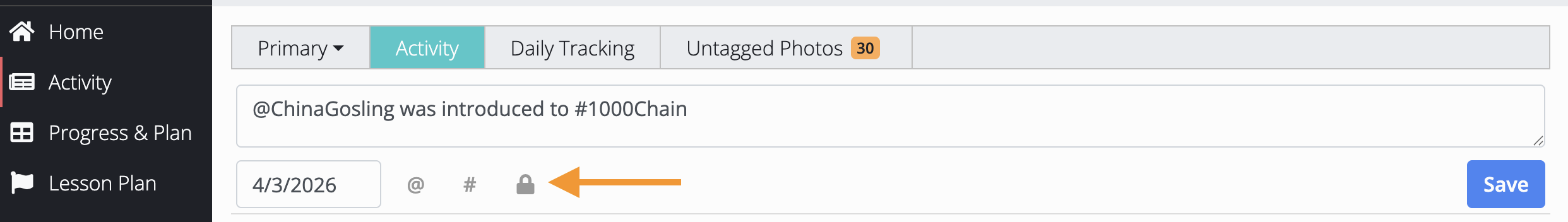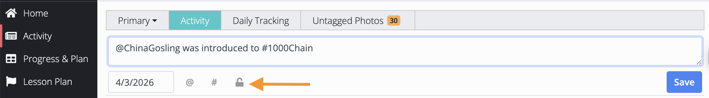 If you're sharing Transparent Classroom with parents, click on the lock button so that it appears to be unlocked. This demonstrates that the record can be viewed by parents. If a lesson is tagged in the record, parents have the ability to click on the lesson name to see the lesson description.