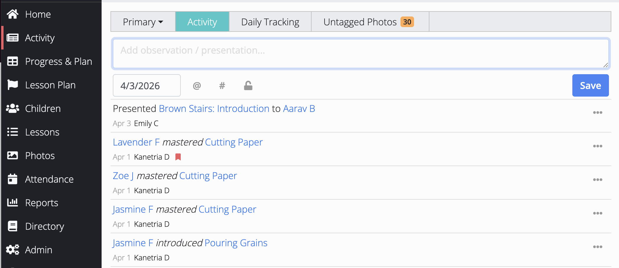 On the [Activity] page you can record presentations that you give and observations about your children and your classroom quickly from a phone, tablet, or computer.